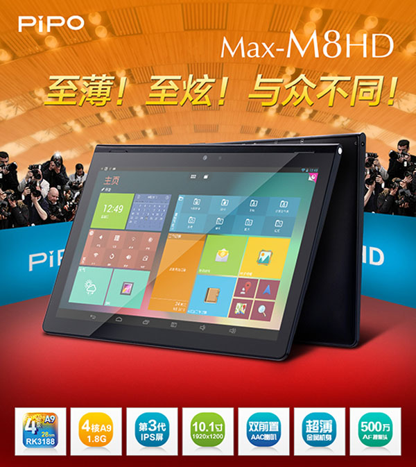 PiPO M8HD是PiPO经典产品M8pro上的全面改进型。M8HD搭载了目前主流平板电脑中最大规格的10.1寸屏幕。16:10的长宽比例使M8HD在浏览网页、观看视频时可以最大限度地利用屏幕的可视面积。值得一提的是,PiPO M8HD采用超窄边框、超薄设计,机器外形尺寸仅为:248×171.8×10.5(mm),是目前最为小巧的10.1寸平板电脑。